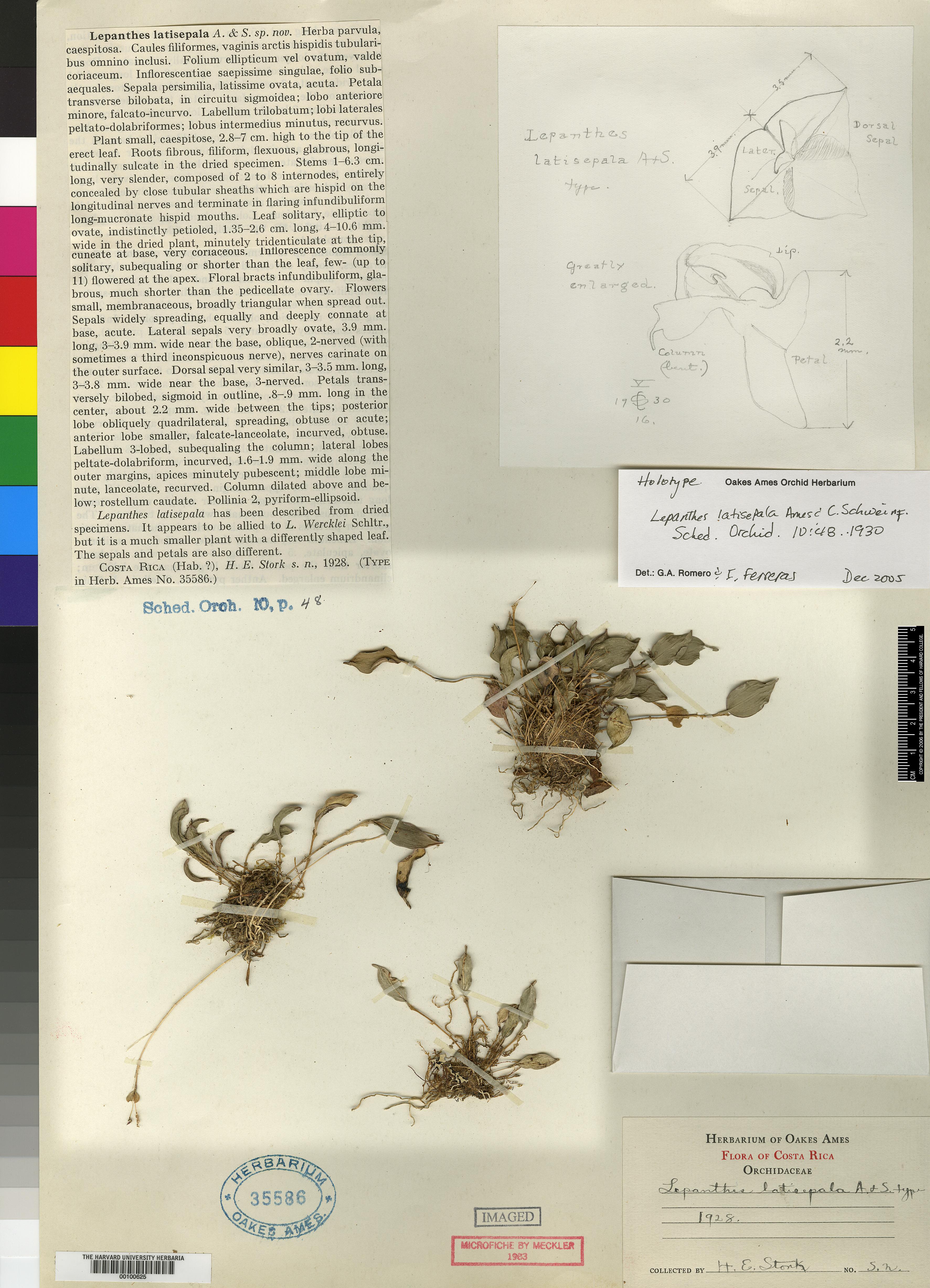 " Lepanthes latisepala has been described from dried specimens. It appears to be allied to L. erinacea but it is a much smaller plant with a differently shaped leaf. The sepals and petals are also different." Ames & Schweinfurth 1930