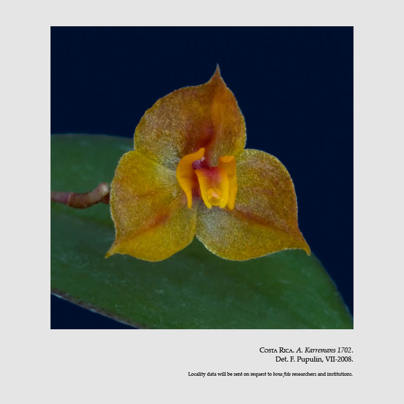 SynonymsReferences W3 Tropicos, Kew Monocot list , IPNI ; Lankester's Epidendra Website CR ; * Schedul. Orchid. 10: 48. Ames & C.Schweinf. 1930; Manual de Plantas de Costa Rica Vol 3 Hammel, Grayum, Herrera and Zamora 2003; Vanishing Beauty; Native Costa Rican Orchids Vol 2 Lacaena to Pteroglossa Pupulin 2020 photo fide;