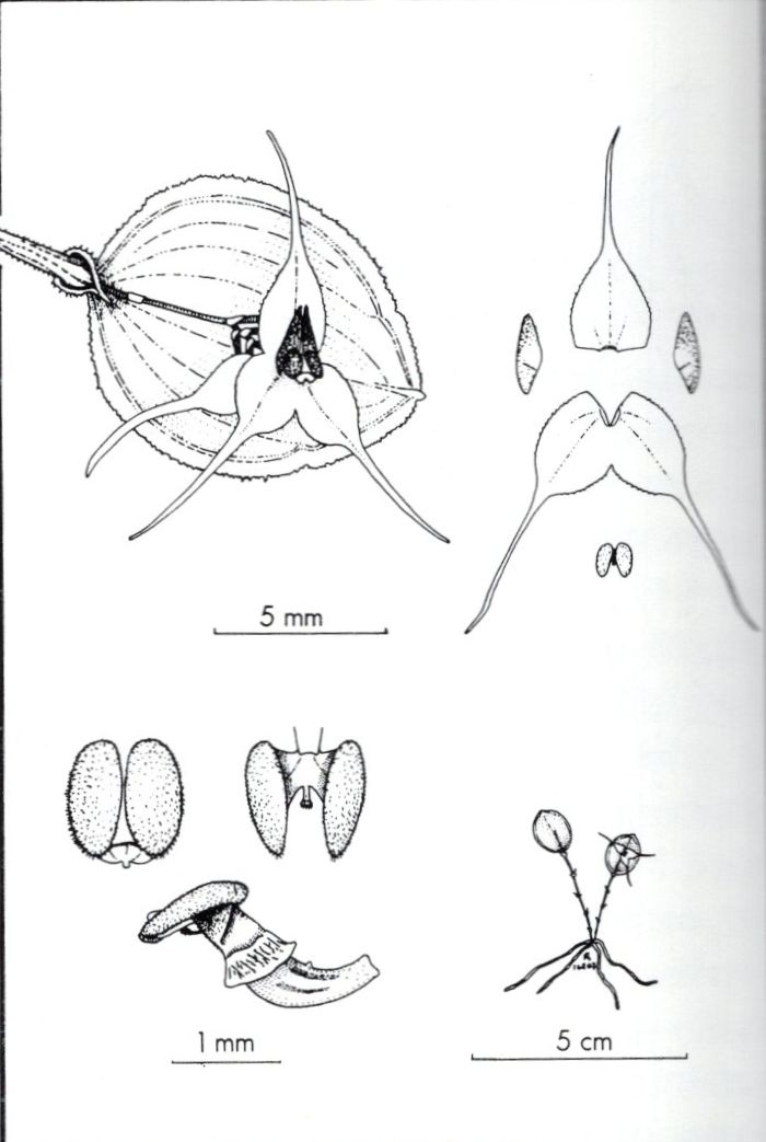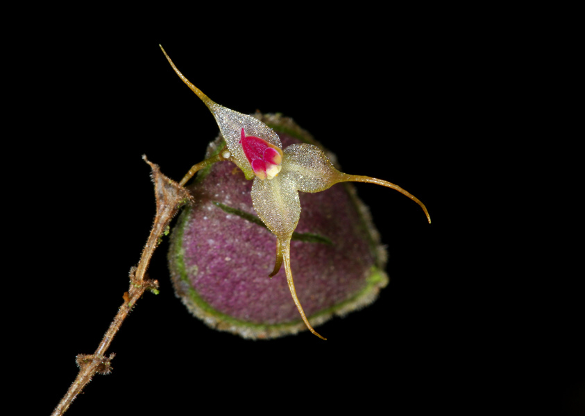 "This rare species occurs as a twig-epiphyte in a wet, windy pass between the departments of Choco and Valle del Cauca. It is distinguished by the very small habit, and ovate leaves with well-defined, broad, crenulate-erose margins. The proportionately large, pale yellow, long-tailed flower with purple petals and lip is borne near the center of the back side of the leaf." Luer & Escobar 1994