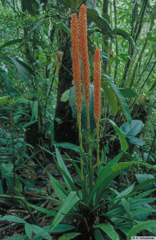 Found in Malaysia, Borneo, Java, Sumatra, New Guinea and the Philippines in mature hill and lower montane forests often on south facing mountains in peaty soils in dense shade at elevations of 700 to 1500 meters as a large sized, hot to warm growing terrestrial with an erect stem carrying many, gradually narrowing to a long pointed tip, leaves set close together in a whorl that attains heights of 5' [150 cm] when in flower with a showy, erect, to 28" [70 cm] long, racemose inflorescence of many complex flowers and many sterile bracts arising in the late winter.