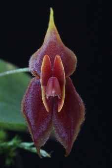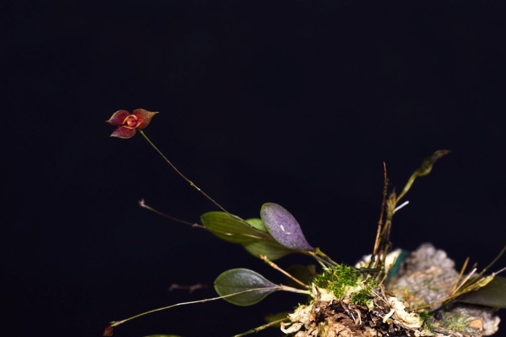 Found in Aragua state of Venezuela in dwarf cloud forests at elevations around 1700 meters as a mini-miniature sized, cool growing epiphyte with erect ramicauls enveloped completely by 3 to 5, inflated minutely ciliate apically, acute lepanthiform sheaths and carrying a single, apical, erect, suborbicular to ovoid, obtuse, abruptly narrowing below into the shortly petiolate base leaf that blooms in the spring on a 2" [5 cm] long, flexuous, successively several flowered inflorescence with triangular, acute floral bracts.