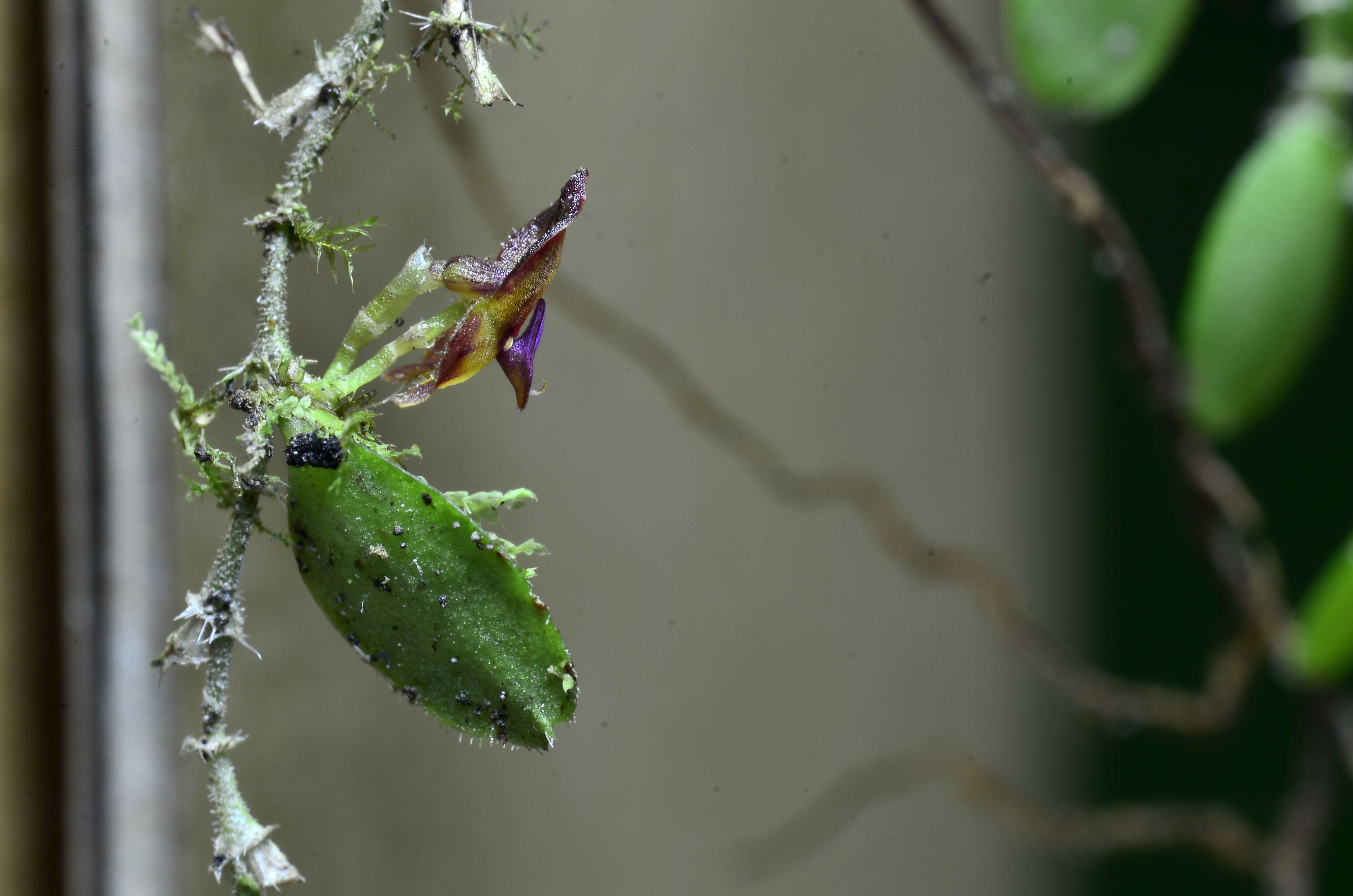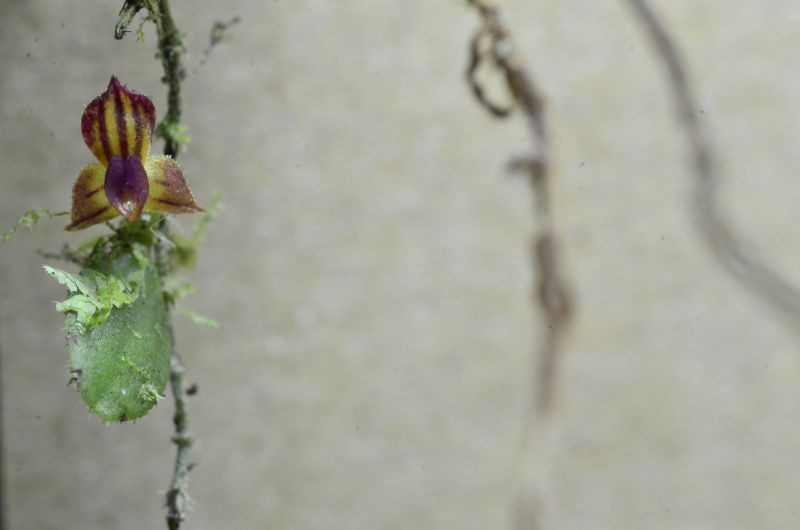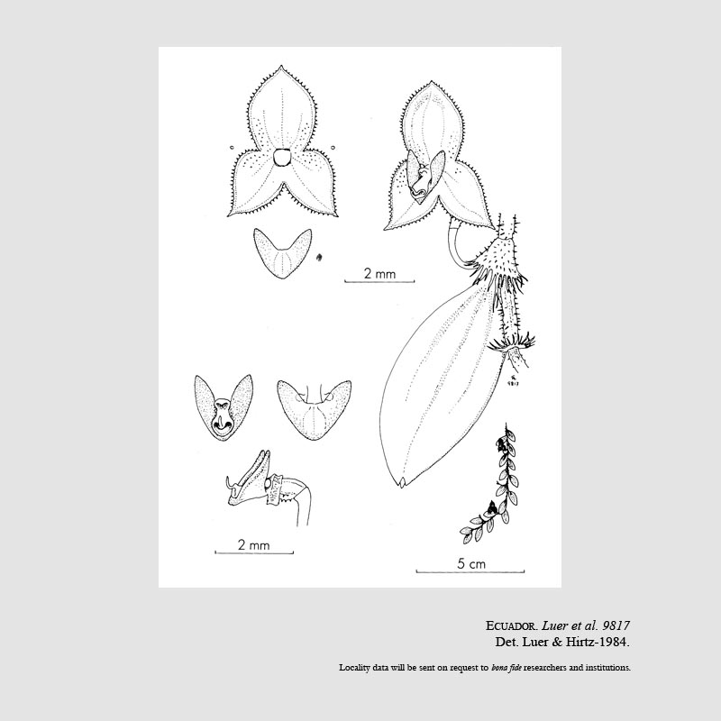 Found in northwestern Ecuador in cloud forests at elevations around 1950 to 2100 meters as a mini-miniature sized, cold growing epiphyte with pendant, long repent, occasionally branching rhizomes giving rise to abbreviated ramicauls concealed by a long-spiculate lepanthiform sheath and carrying a single, apical, descending, coriaceous, shortly and sparsely pubescent, broadly elliptical, subacute to obtuse apically, 3 veined, contracted below into the petiolate base leaf that blooms in the late summer and early fall on an ascending, slender, .08 to .1" [2 to 2.5mm] long, singleflowered inflorescence.