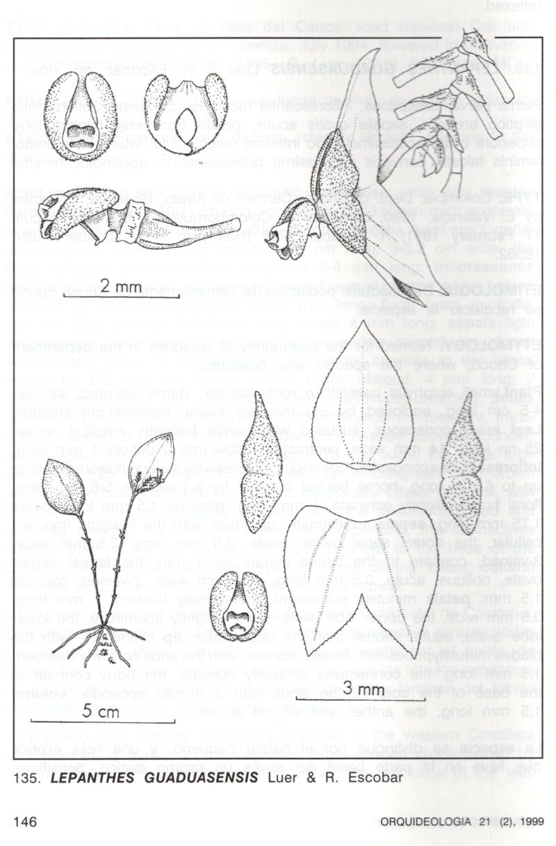 References W3 Tropicos, Kew Monocot list , IPNI ; * Orquideología Vol 21 #2 pg 151–154, f. 138 Luer & Escobar 1999 drawing fide; Orquideología 21(2): 145–147, f. 135 Luer & Escobar 1999 as L guaduasensis drawing fide; Icones Pleurothallidinarum Vol XXXII Luer 2012 drawing fide; A Colombian Treasure Vol 3 Ortiz & Uribe 2019 drawing/photo fide;