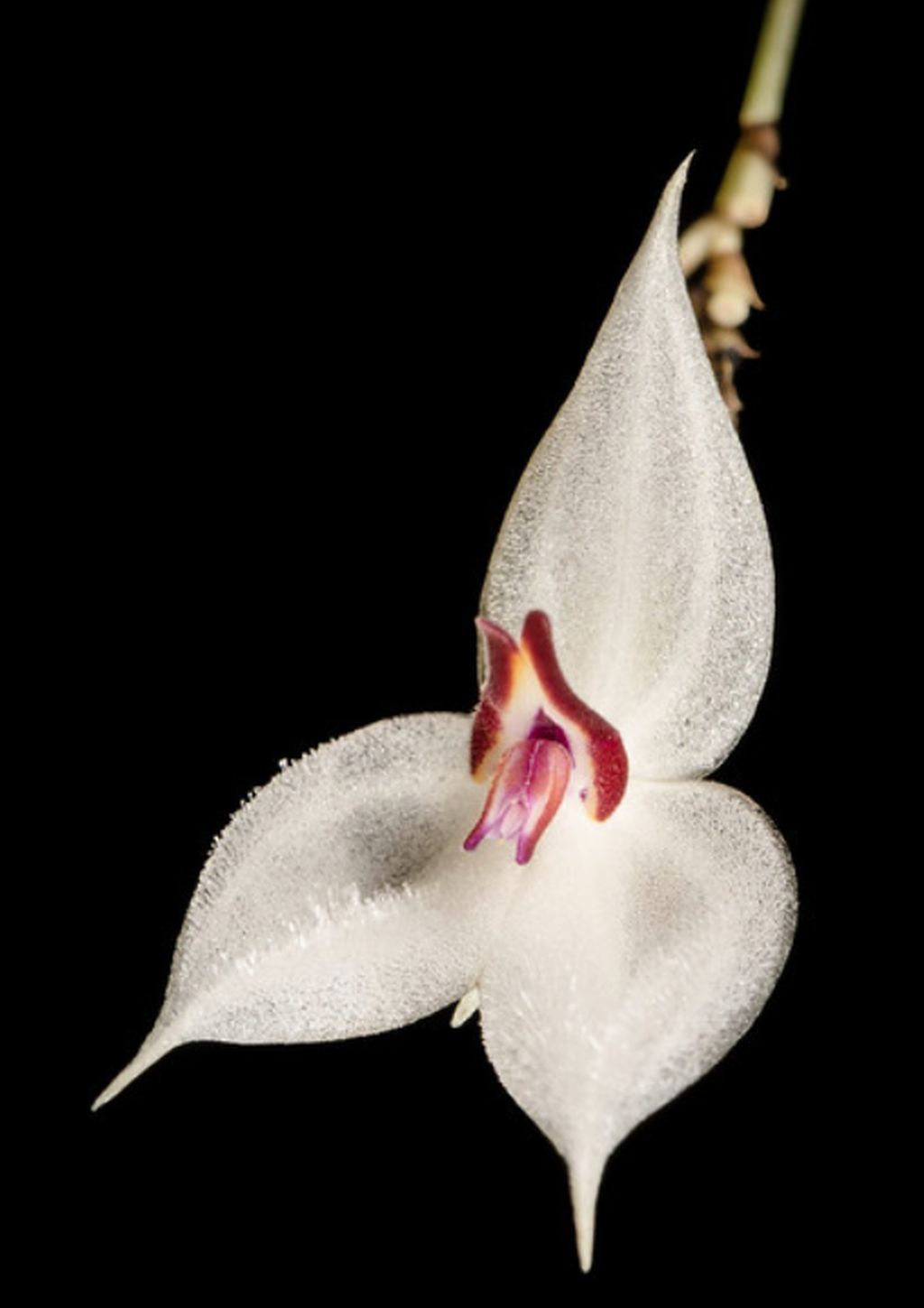 "Recognized by the large size, and large flowers borne ina congested raceme shorter than the leaf. The sepals are white with the apices produced into short tails, the lateral sepals are shortly pubescent, the petals are transversely oblong and the pubescvent appendix is terminated by a diverging pair of lobules." Luer 1996