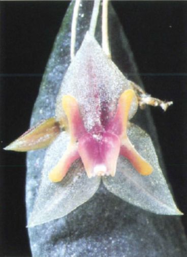 Found only in northern Oaxaca state of Mexico in cloud forests at elevations of 2300 to 2350 meters as a mini-miniature sized, cool growing epiphyte with erect to ascending, slender ramicauls enveloped basally by 4 to 5 lepanthiform sheaths and carrying a single, apical, ovate to elliptical, fleshy-coriaceous, tridenticulate, gradually narrowing below into the short petiolate base leaf and blooming in the spring on 1 to 3 per ramicaul with only one blooming at a time, always shorter than the leaf, to .6" [1.5 cm] long, successively single flowered with up to 4 flowers, distichous, slightly flexuous, racemose inflorescence holding the flowers close against the back of the leaf.