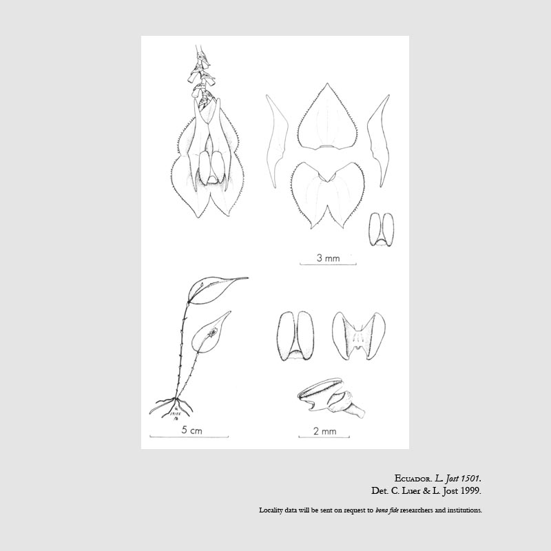 References W3 Tropicos, Kew Monocot list , IPNI ; *Icones Pleurothallidinarum Vol XVIII Systematics of Pleurothallis subsection Antenniferae, Longiracemosae, Macrophyllae-Racemosae and Subgenera Pseudsostelis and Acuminata Luer 1999 drawing fide; Flora of Ecuador No 88 Lepanthes and affiliates Dodson & Luer 2011 drawing fide