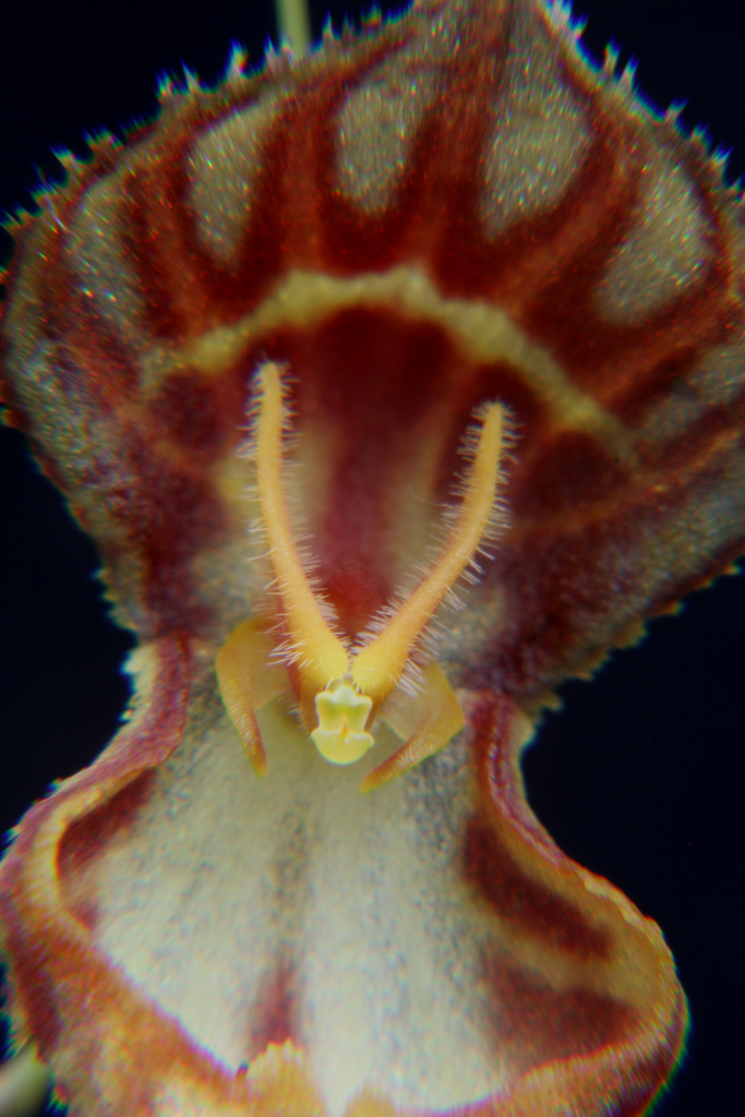 Found in Huanuco department of Peru at elevations around 1900 to 2000 meters as a miniature sized, cool to cold growing epiphyte with slender, erect ramicauls enveloped by 4 to 5 microscopically scabrous lepanthiform sheaths with thick margins and carrying a single,a pical, erect, coriaceous, broadly elliptical-ovate, obtuse, broadly cuneate and contracted below into the petiolate base that blooms in the winter on a longer than the leaf, peduncle slender, .8 to 1.6" [2 to 4 cm] long, rachis to 2.4 to 3.2" [6 to 8 cm] long, lax, successively single, few flowered inflorescence with minutely muricate, shorter than the ovary floral bracts.