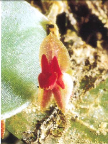 Found in Oaxaca and Chiapas states of Mexico and Guatemala on mountain tops and ridges at elevations around 1300 to 1750 meters as super-mini-miniature sized, cool, pendulous growing epiphyte with erect, thin, terete, 4 noded ramicauls enveloped by 3 to 4 lepanthiform sheaths and carrying a single, apical, hanging, flat to slightly concave, coriaceous-fleshy, elliptic-suborbicular, obtuse, rarely subacute tridentate, cuneate below into the shortly petiolate base leaf that blooms in the late summer through spring on 1 to 7 per ramicaul, but only one per year, peduncle, to .04 to .16” [1 to 4 mm] long, occasionally as long as 2/3 of the leaf, on the adaxial side, .12 to .52” [3 to 13 mm] long ovarall, subsecund, successively 1 at a time, 2 to 11 flowered inflorescence with obliquely infundibuliform, cucullate, lepanthiform floral bracts.
