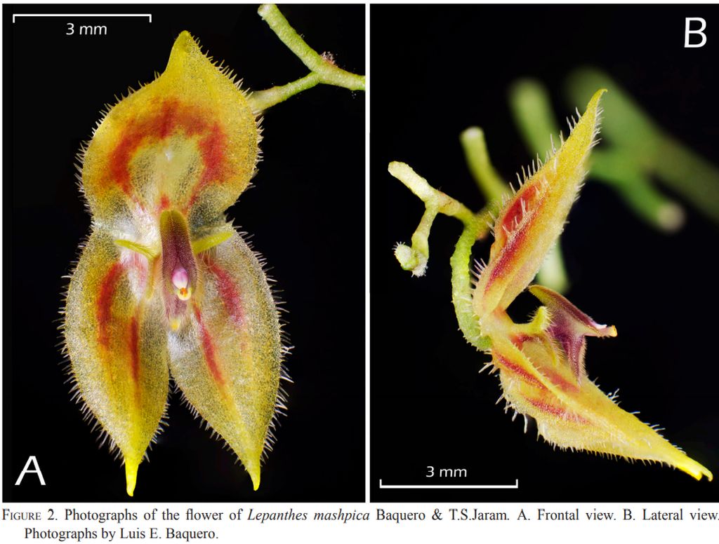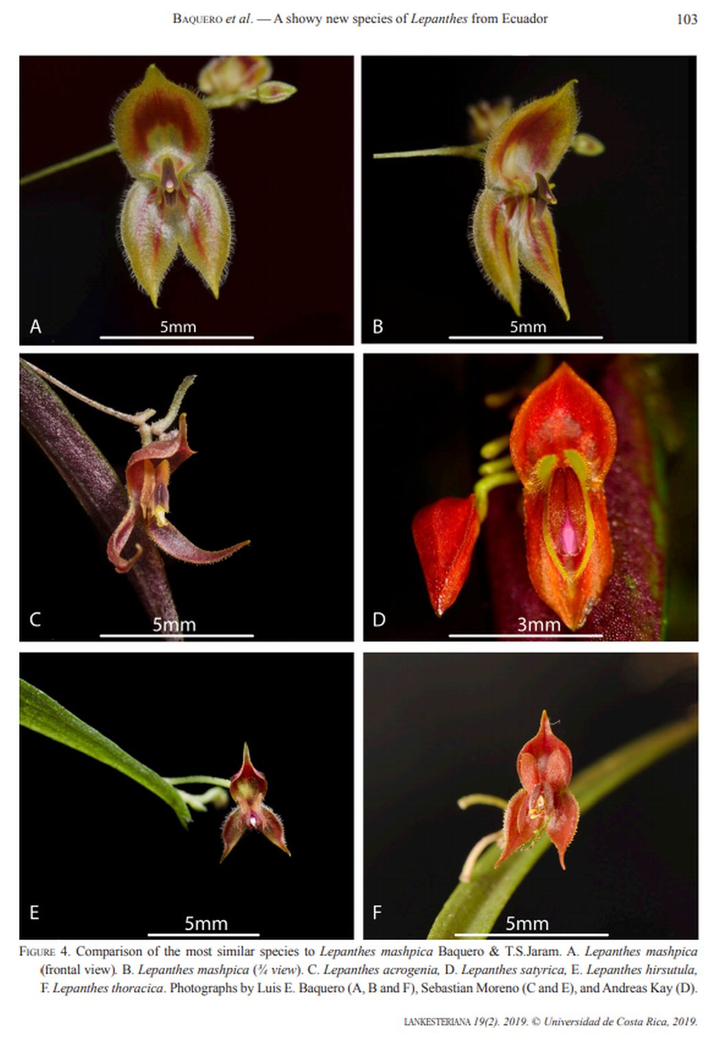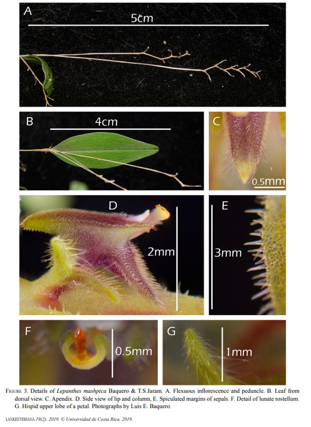 ”Lepanthes mashpica is most similar to L. satyrica Luer & Hirtz, both bearing a lip with an elongated, descending, triangular process. Lepanthes mashpica is distinguished by the spiculate margins of the sepals (vs. minutely cellular-denticulate), the long-pedicellate, inflorescence, successively severalflowered raceme, borne near the apex of the leaf (vs. short inflorescence, successively few-flowered raceme, borne close to the base of the leaf), the petals very small, transversely bilobed, upper and lower lobes similar in size and shape, narrowly oblong, hispid (vs. transversely bilobed petals with a minute apiculum on the margin between the lobes, the upper lobe long-pubescent, the lower lobe, short-pubescent), a lunate and curved apex of the rostellum (vs. truncate, straight apex of the rostellum) and the appendix simple, acute and pubescent (vs. vertically bilobed appendix).” Baquero etal 2019