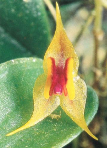 Found in Chiapas state of Mexico and Guatemala in mossy cloud forests at elevations of 2500 meters as a mini-miniature sized, cold growing epiphyte with a slender, arching ramicaul enveloped by 4 to 5, imbricate, scarious, lepanthiform sheaths with dilated ostia carrying a single, apical, erect, fleshy, dark green, ovate to ellipitic, acute, tridenticulate apically, gradually narrowing below into the short petiolate base leaf that blooms in the spring and summer on 1 to 4, filiform, .08 to .24" [2 to 6 mm] long, successively single to 9 flowered inflorescence arising on the back of the leaf.