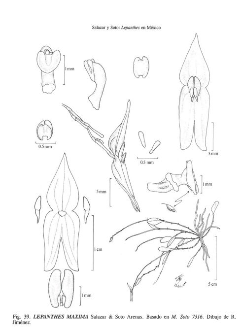 "Lepanthes maxima has the largerst flowers of Lepanthes in Mexico up to .88" [2.2 cm] tall. The species is recognized by the elliptic-obovate leaves, the synsepal proiportionally larger and narrower, the lateral sepals oblong-lanceolate, obtuse and subtruncate, the lower lobe of the petals is triangular-linear, acuminate and the laminae of the lip obscure the column other than the anther.