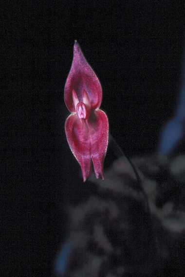 Found in Chiapas state of Mexico and Guatemala in perennial rainforest and pine forests at elevations of 1350 to 1600 meters as a miniature sized, warm to cool growing epiphyte with erect to ascending, slender ramicauls completely enveloped by 5 to 6 lepanthiform sheaths and carrying a single, apical, elliptic to ovate, obtuse to rounded, fleshy coriaceous, tridenticulate, gradually narrowing below into the cuneate and shortly petiolate base leaf that blooms in the winter and summer on to 3 per ramicaul, but only one flowering at a time, lateral, longer than the leaf, to 1" to 1.8" [2.5 to .3.75 cm] long, filiform, terete, subdistichous, sinuous, lax, successively single flowered inflorescence arising from the apex of the ramicaul with up to 5 flowers.