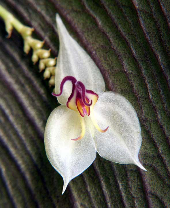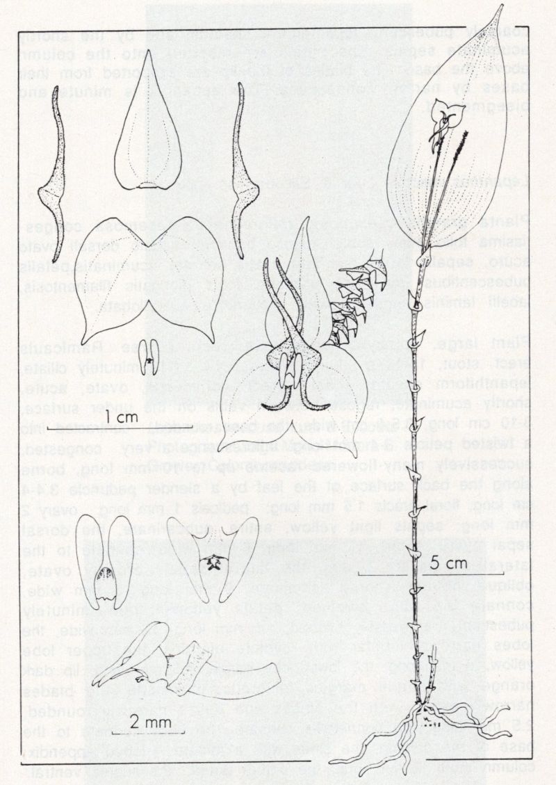 Found in Antioquia department of Colombia at elevations of 2000 to 2400 meters as a medium sized, cold growing epiphyte with erect, stout ramicauls enveloped by 11 to 12, minutely ciliate lepanthiform sheaths and carrying a single, apical, erect, coriaceous, ovate, acute, shortly acuminate, rugose between the purple flushed veins on the underside, rounded and contracted into the twisted, petiolate base base leaf that blooms in the spring on a few, terminal, 1.6" [4 cm] long, successively single, several flowered inflorescence arsing on the back side of the leaf.