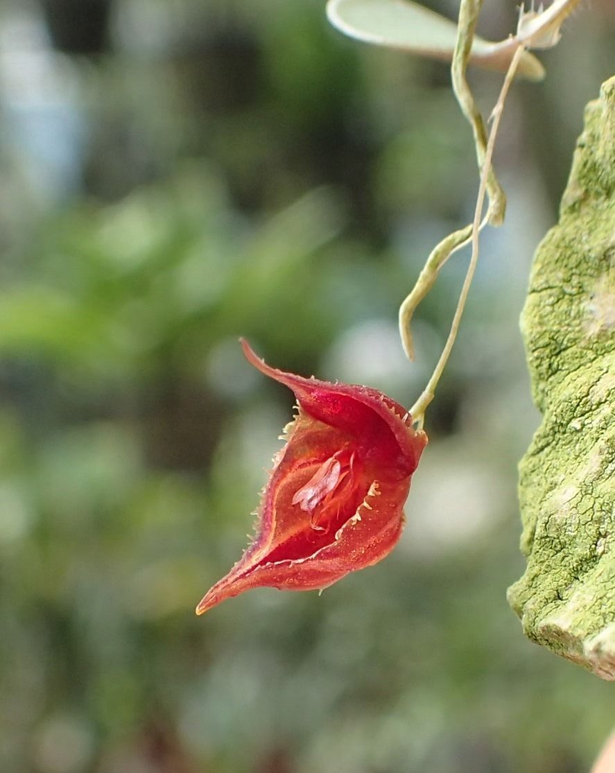 Found in Zamora Chinchipe province of Ecuador in cloud forests at elevations around 1800 meters as a mini-miniature sized, cool growing epiphyte with a slender, erect ramicaul enveloped by 5 to 7, long-ciliate lepanthiform sheaths and carrying a single, apical, erect, coriaceous, broadly elliptical to suborbicular, obtuse to rounded, rounded and contracted below into the petiolate base leaf that blooms in the late summer and early fall on a filiform, flexuous, distichous, .6" [1.5 cm] long, successively single, several flowered inflorescence.