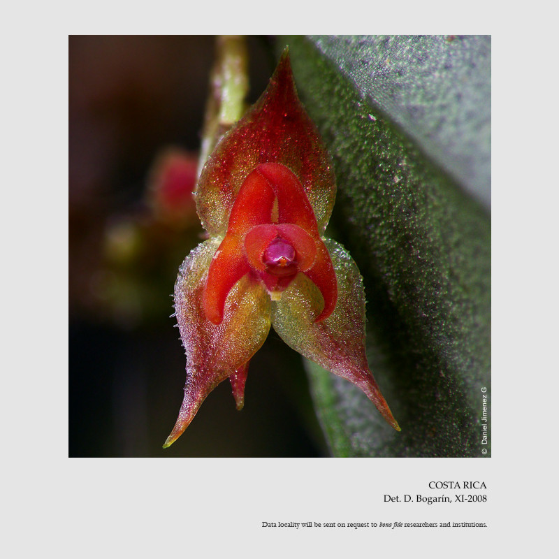 Found in Costa Rica at elevations around 1400 to 1500 meters as a mini-miniature sized, cool growing epiphyte with a slender ramicaul enveloped by 4 to 7 lepanthiform sheaths and carrying a single, apical, erect, coriaceous, ovate, acute, broadly cuneate below in to the petiolate base leaf that blooms in the spring through fall on a congested, distichous, filiform, .32" [8mm] long, racemose, successively several flowered inflorescence arising from behind the leaf with muriculate floral bracts.