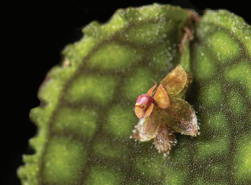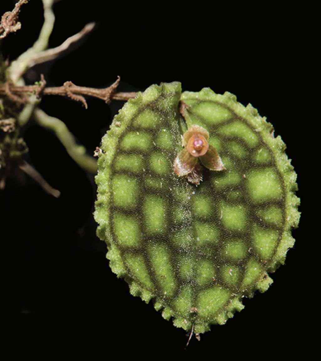 Found in Valle de Cauca department of Colombia in secondary vegetation on the western slope of the Western Cordillera at elevations around 300 to 640 meters as a mini-miniature sized, .8" [2 cm] tall, hot to warm, caespitose growing epiphyte with slender, erect ramicauls , enveloped by 5 to 6, microscopically ciliate-scabrous lepanthiform sheaths carrying a thinly coriaceous, light green, heavily reticulated with purple, subcircular to broadly ovate, broadly obtuse, with a marginal vein, margins undulate and velvety, cordate and abruptly contracted below into the petiolate base leaf that blooms at least in the later spring on a a congested, distichous, borne on top of the leaf, peduncle slender to .08" [2 mm] long, up to .12 to .16" [3 to 4 mm] long overall, successively single, several-flowered inflorescence with echinate, as long as the ovary floral bracts.