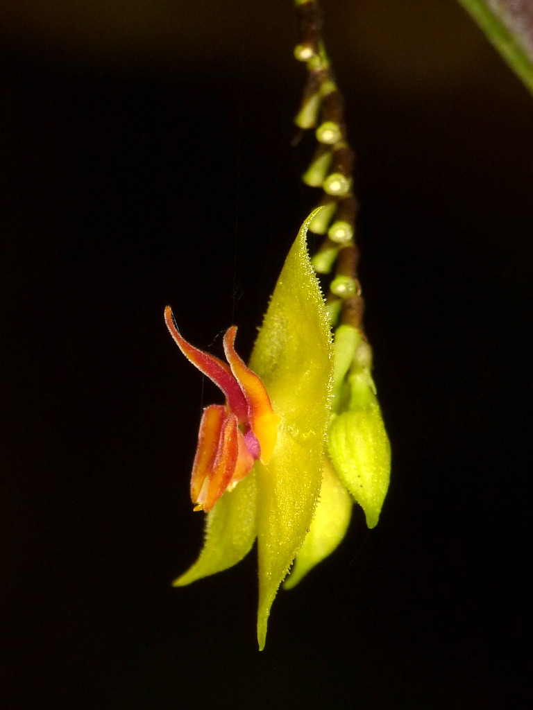 Found in Cundinamarca department of Colombia and Carchi province of Ecuador at elevations around 3300 to 3600 meters as a probable miniature sized, cold growing epiphyte with a slender, erect? ramicaul carrying a single, apical, erect?, coriaceous, elliptical, acute to lightly acuminate, cuneate below into the petiolate base leaf that blooms in the spring on a filiform, dense, distichous, 1.4" [3.5 cm] long, successively many flowered inflorescence arising on the back of the leaf.