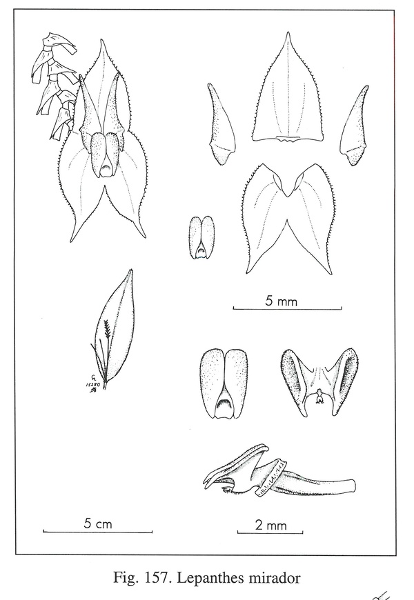 References W3 Tropicos, Kew Monocot list , IPNI ; *Icones Pleurothallidinarum Vol XIV Systematics of Draconanthes, Lepanthes subgenus Marsipanthes and subgenus Lepanthes of Ecuador Luer 1996 drawing fide;Flora of Ecuador No 88 Lepanthes and affiliates Dodson & Luer 2011 drawing fide; Icones Pleurothallidinarum Vol XXXII Luer 2012 drawing fide; Orchids, A Colombian Treasure Vol 3 Ortiz & Uribe 2019 as L aff mirador photos ??;