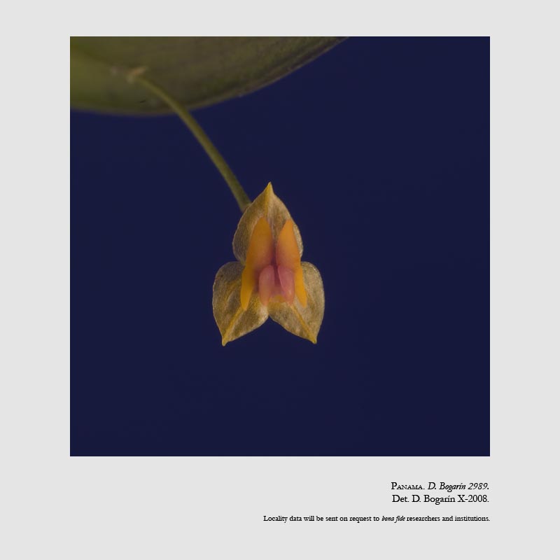 Found in Chiriqui department of Panama in wet forests at elevations around 1500 meters as a mini-miniature sized, cool growing epiphtye with slender, erect ramicauls enveloped by 10 to 11 scabrous, lepanthiform sheaths with dilated, long-acuminate ostia and carrying a single erect to suberect, thin, subcoriaceous, ovate-elliptical, acute, acuminate, cuneate-rounded and contracted below into the petiolate base leaf that blooms in the winter on a filiform peduncle, .36 to .8" [.9 to 2 cm] long, arising on top of the leaf, rachis congested, distichous, to .4" [1 cm] long, successively single, many flowered inflorescence with minutely muriculate floral bracts.