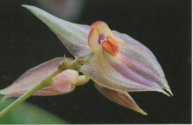 Found in Colombia, Ecuador, Peru and Bolivia in cloud forests at elevations around 1700 to 3500 meters as a small to medium sized, cool to cold growing epiphyte with an erect, slender to stout ramicaul enveloped by 9 to 14, minutely ciliate, lepanthiform sheaths and carrying a single, apical, erect, thinly coriaceous, oblong-ovate, acute, acuminate, cuneate to rounded below into the contracted, petiolate base leaf that blooms late winter through summer on a filiform, congested, distichous, 3.2" [8 cm] long including the 1.6" [4 cm] long peduncle, racemose, successively single, many flowered inflorescence arising from behind the leaf.