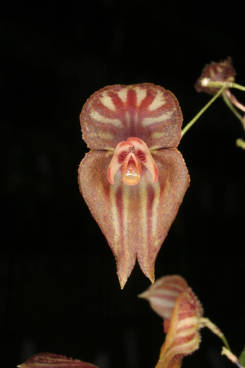 Found in Ecuador without collection data as a very small sized, caespitose epiphyte with slender, erect ramicauls enveloped basally by 4 to 5 very small, scabrous, lepanthiform sheaths carrying a single, apical, erect, coriaceous, broadly ovate, obtuse leaf with it's base broadly cuneate to rounded, and contracted into a petiole that blooms in the spring on a subcongested, distichous, successively few flowered raceme holding the large flowers to beyond the leaf's length. Without collection data, purchased from José Portilla by Philip Muller, Cultivated at Mountain View, CA, March 1998. C. Luer illustr. 18785.