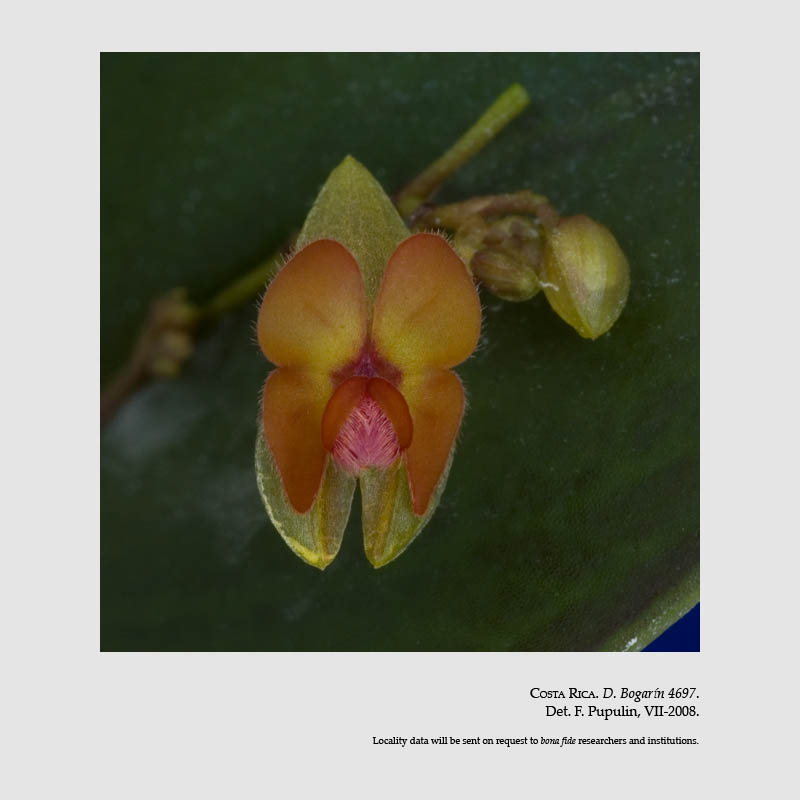Found in Costa Rica in cloud forests at elevations around 1800 to 3000 meters as a mini-miniature sized, cool to cold growing epiphtye with slender, erect, arching ramicauls enveloped completely by 7 to 9, lepanthiform sheaths and carrying a single, apical, erect, coriaceous, ovate, acuminate, rounded below and contracted into the petiolate base leaf that blooms in the late spring summer and early fall on a congested, distichous, successively single several flowered, to .35" [9 mm], racemose inflorescence arising from behind the leaf.