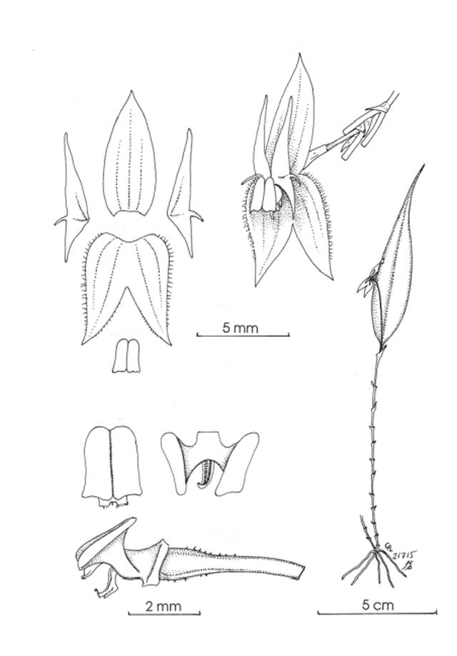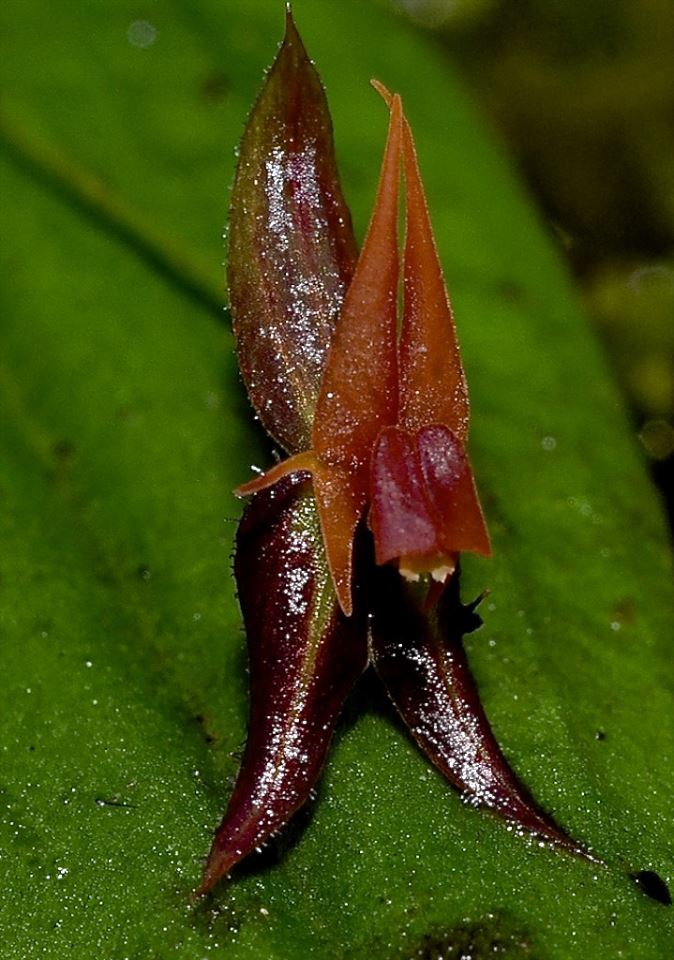 Found in Esmeraldas province of Ecuador at elevations around 1800 meters as a mini-miniature sized, cool growing, caespitose epiphyte with slender, erect ramicauls enveloped by 10 to 12, slightly dilated, microscopically scabrous lepanthiform sheaths and carrying a single, apical, erect, coriaceous, elliptical-ovate, acute, acuminate, cuneate below intothe petiolate base leaf that blooms in the fall on an erect, from the apex of the ramicaul, peduncle 1.2" [3 cm] long, rachis .12' {3 mm] long, congested, successively single, many flowered inflorescencewith shorter than the pedicel floral bracts and carrying flowers with light yellow sepals, orange with red medially petals and a red lip.