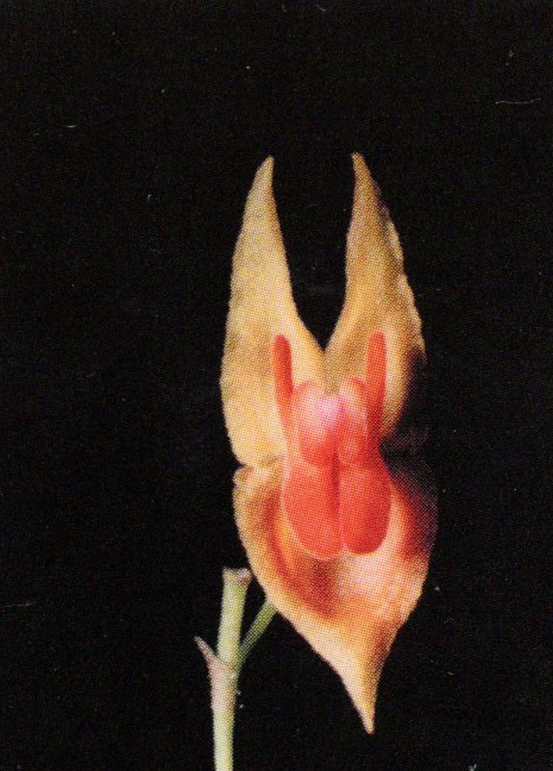 Found in San Marcos department of Guatemala in cloud forests at elevations around 1500 meters as a mini-miniature sized, cool growing epiphyte with very short ramicauls enveloped by 2 to 3, imbricate, tubular, cilate lepanthiform sheaths and carrying a single, apical, orbicular-elliptic, rounded apically, tridentate, the median lobe triangular, the laterals obliquely acute apically, petiolate base leaf that blooms in the spring on 1 to 2, .72 to 1.32" [1.8 to 3.3 cm] long, successively single, 5 to 10 flowered inflorescence carrying non-resupinate flowers.