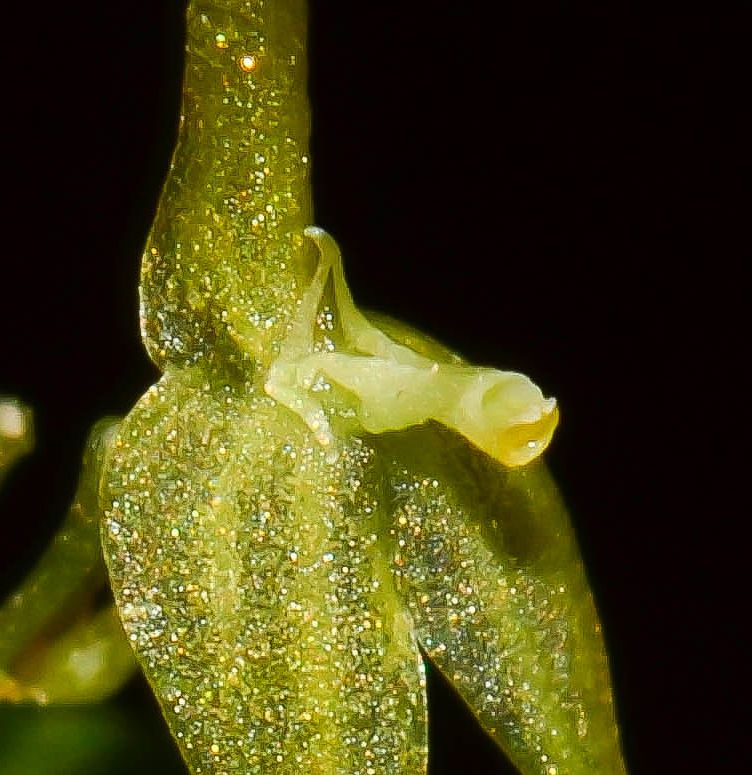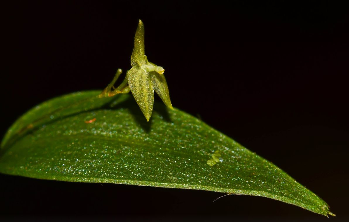 "This little species is characterized by minute, yellow flowers borne on top of a small, horizontal leaf; entire, ovate sepals; tiny, filamentous petals; and an erect, cylindrical column embraced by the lobes of a shorter lip." Luer & Escobar 1991