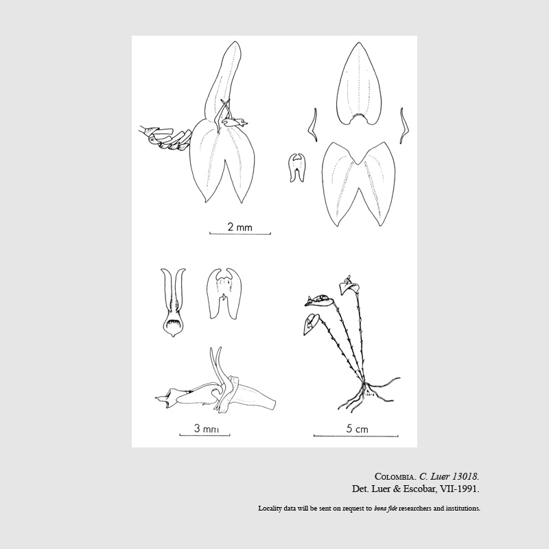 References W3 Tropicos, Kew Monocot list , IPNI ; * Orquideologia 18[1]: 66 Luer & R.Escobar 1991 Drawing fide; Icones Pleurothallidinarum Vol XXXII Luer 2012 drawing fide; Orchids, A Colombian Treasure Vol 3 Ortiz & Uribe 2019 drawing/photo fide;