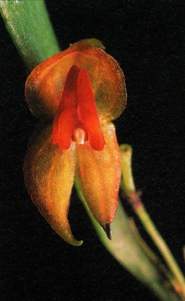 "This little species is superficially similar to many others, differing in a combination of details. The inflorescence is a subcongested raceme shorter than the elliptical leaf; the sepals are red-orange and acute; the petals are red, transverse and convex with the lower lobe triangular and acute, much smaller than the oblong upper lobe; the blades of the lip are oblong and convex with the connectives at the base; and the appendix is rounded and pubescent, filling the sinus." Luer & Behar 2000