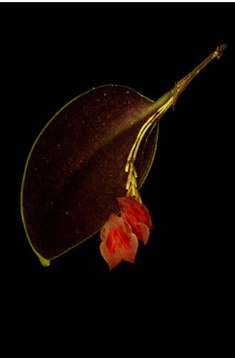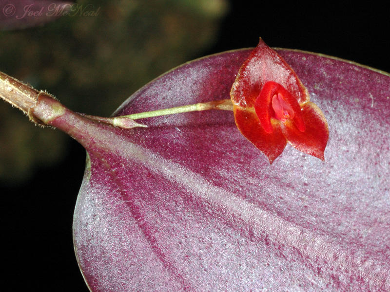 Found in Jamaica at elevations of 1175 to 1500 meters as a mini-miniature sized, warm to cool growing epiphyte with slender, erect ramicauls enveloped by 6 to 10, minutely ciliate lepanthiform sheaths and carrying a single, apical, erect, thinly coriaceous, purple suffused, elliptic, acute, slightly acuminate, cuneate below into the petiolate base leaf that blooms in the winter through fall on a filiform, congested, distichous,.64 to 1.04" [1.6 to 2.6 cm] long including the .24 to .64" [6 to 16 mm] long peduncle, successively single, several flowered inflorescence arising on the back of the leaf and has echinate floral bracts.