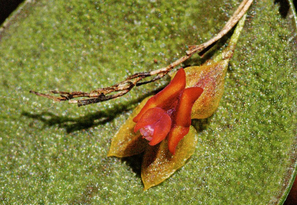 Found in central to western Cuba at elevations around 600 to 1100 meters as a mini-miniature sized, warm to cool growing epiphyte with erect, slender ramicauls enveloped by lepanthiform sheaths and carrying a single, apical, erect, coriaceous, elliptical to ovate, acuminate leaf that blooms at most any time of the year on a filiform, congested, distichous, to .4 to .6" [1 to 1.5 cm] long, successively single, several flowered inflorescence arising on top of the leaf.