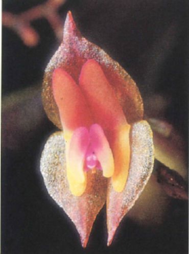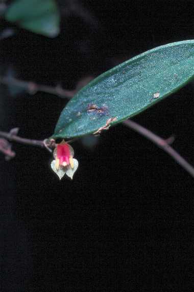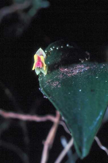 Found in southern Mexico to Guatemala at elevations of 2100 to 3200 meters as a miniature sized, cold growing epiphyte with erect, slender ramicauls enveloped completely by 3 to 5 lepanthiform sheaths and carrying a single, apical, broadly suborbicular-elliptic to elliptic, obtuse to subacute, tridenticulate apically, fleshy, dark green, purple suffused, convex, cuneate below or abruptly contracted into the twisted, petiolate base leaf that blooms in the spring and fall if not more on one to two, 3.4" [8.5 cm] long, successively single flowered, thin inflorescence arising either above or below the leaf with up to 22 flowers.