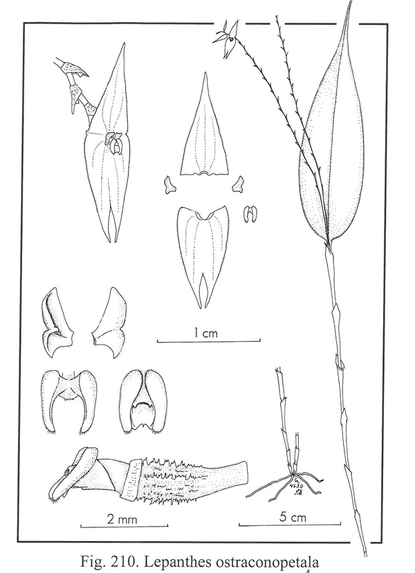 "This large species, apparently endemic at a high altitude in southernmost Colombia, is vegetatively indistinguishable from Lepanthes illex, which is widely distributed in northern Ecuador. Both species are characterized by ramicauls usually longer than twenty centimeters, and a usually large, acuminate leaf surpassed by a successively many-flowered raceme of flowers with narrowly acute sepals. Lepanthes ostraconopetala is distinguished by convex petals with recurved margins with an apiculum between the lobes. The blades and body of the lip are narrower, and the tip of the minute appendix is microscopically bilobed." Luer 2009