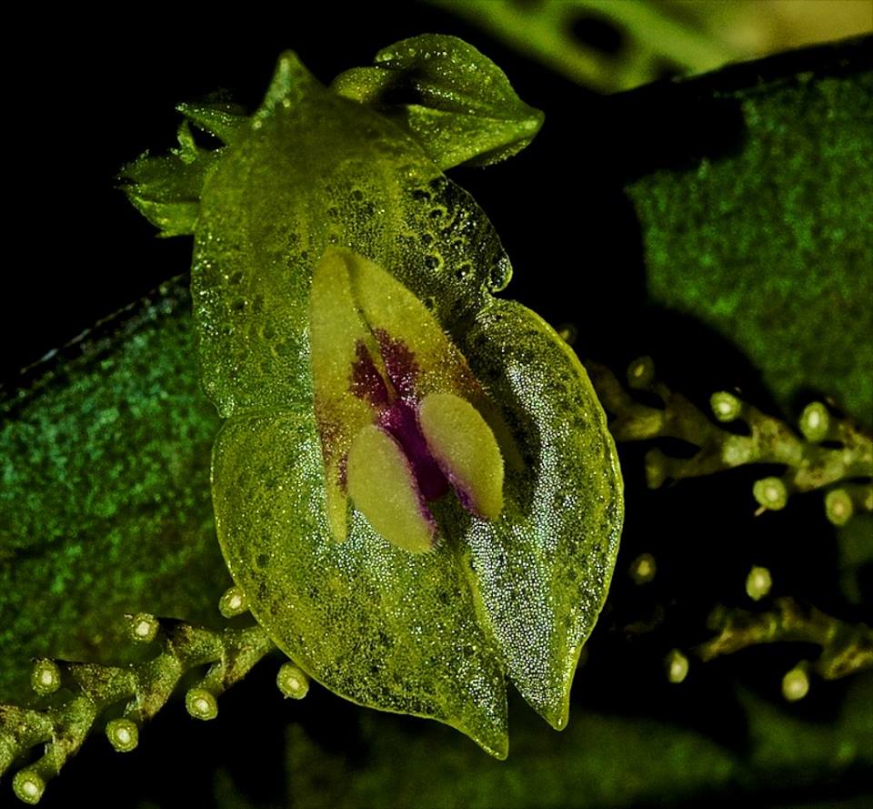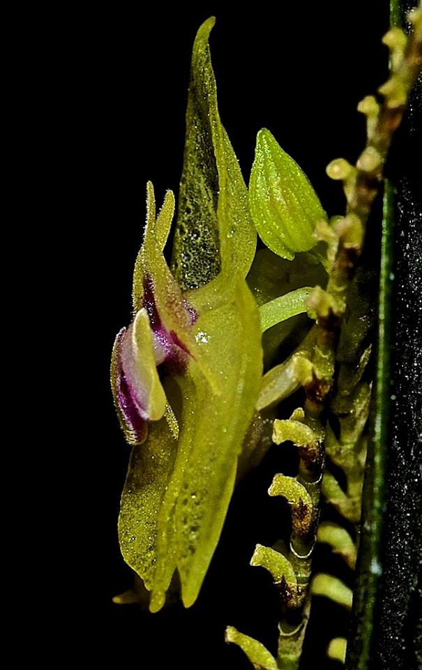 Found in Morona-Santiago province of Ecuador at elevations around 2500 meters as a miniature sized, cold growing, caespitose epiphyte with slender, erect ramicauls enveloped by 8 to 9, acute, lepanthiform sheaths and carrying a single, apical, erect, coriaceous, elliptical, obtuse, shortly acuminate at the tip, cuneate below into the petiolate base leaf that blooms in the fall on 2, arising from the apex of the ramicaul, peduncle .8 to 1.2" [2 to 3 cm] long, rachis to 1.2" [3 cm] long, congested, distichous, successively single, many flowered inflorescence with shorter than the ovary floral bracts.