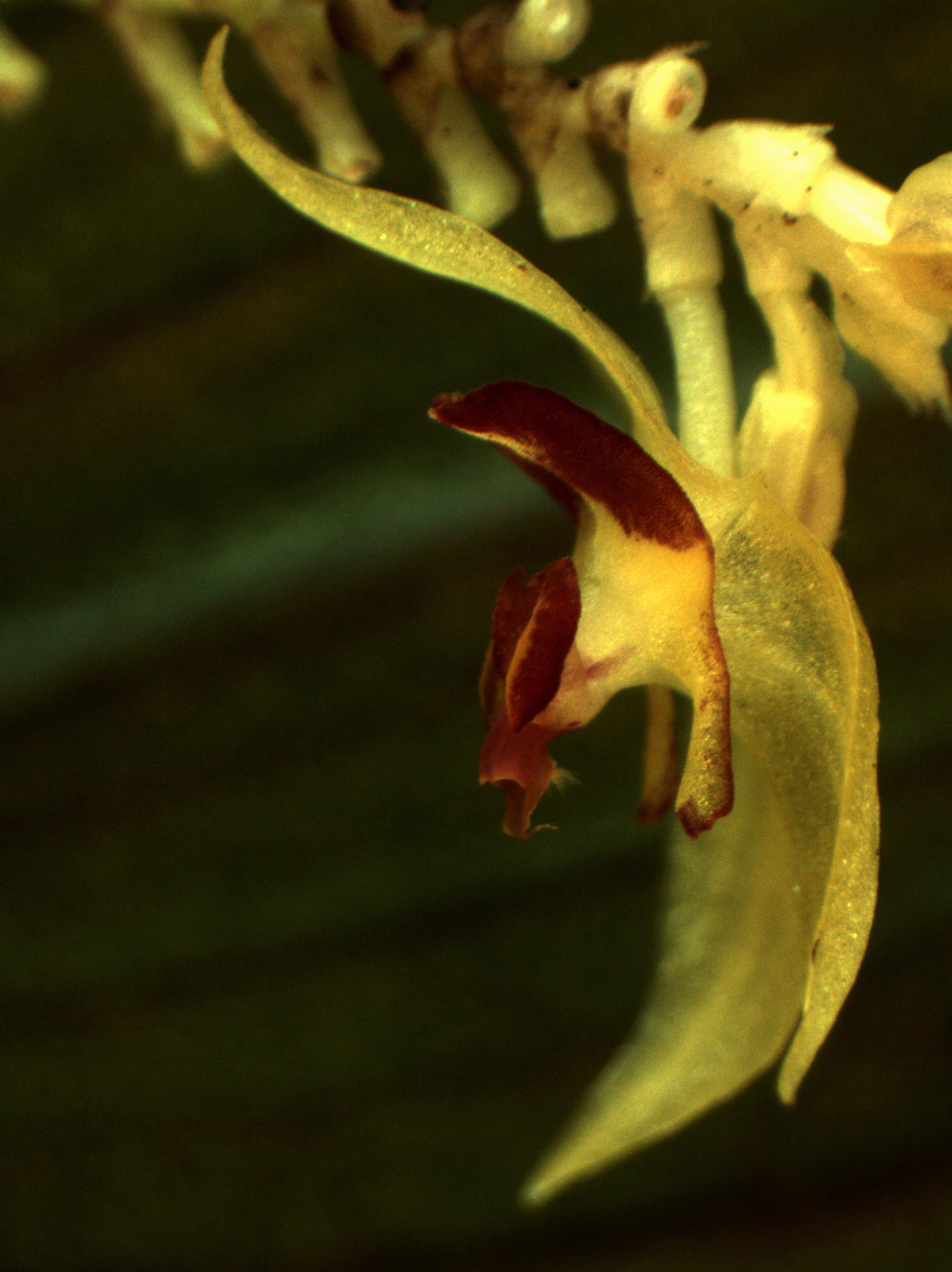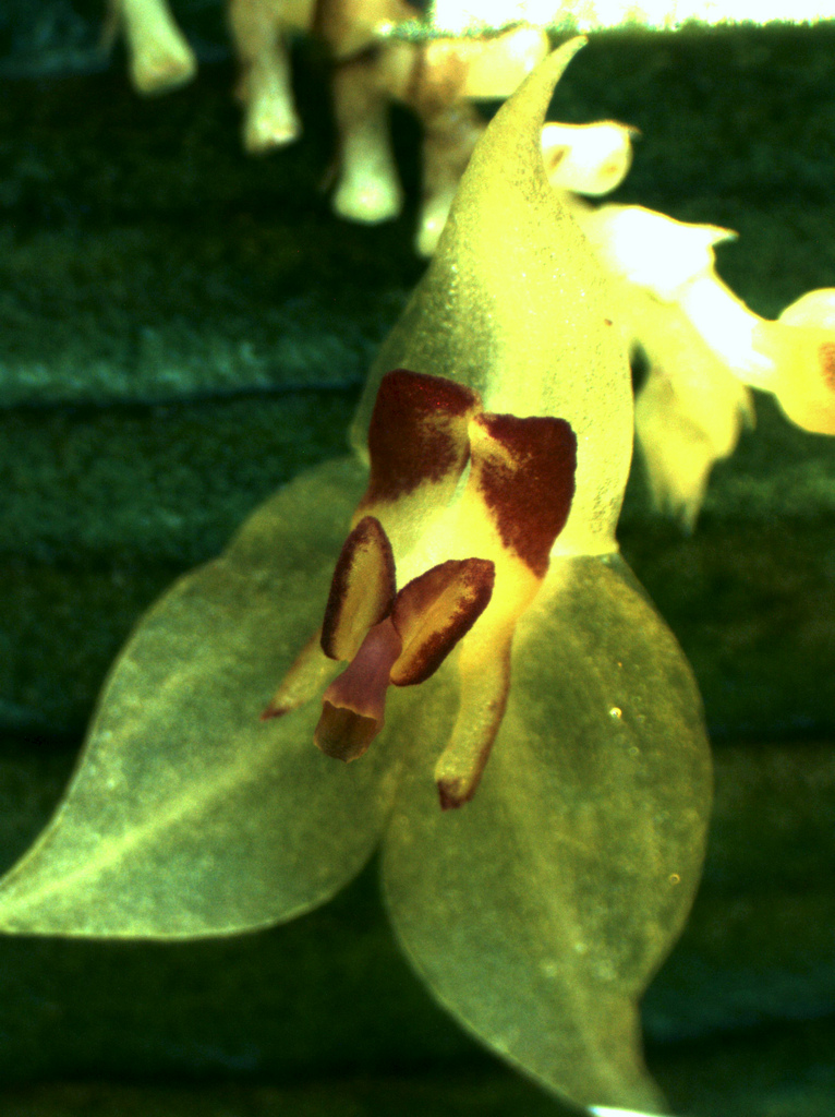 Found in Norte de Santander department of Colombia in cloud forests at elevations of 2100 as a small to medium sized, cool growing epiphyte with erect, slender ramicauls enveloped by 15 to 20 minutely ciliate, leapanthiform sheaths and carrying a single, apical, erect, thinly coriaceous, ovate, acute, acuminate, basally rounded and contracted into the twisted petiolate base leaf that blooms in the spring and summer on a beneath the leaf, filiform, to 1 3/4" [to 4.8 cm] long, congested, distichous successively single flowered, racemose inflorescence