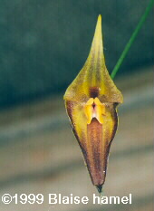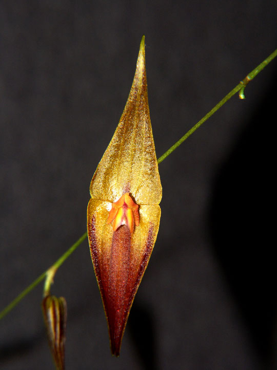 Found in southern Colombia and northern Ecuador as a miniature sized, cold growing epiphyte around 2300 to 2925 meters in elevation with erect, slender ramicauls enveloped by 7 to 9, minutely ciliate lepanthiform sheaths and carrying a single, apical, erect, coriaceous, elliptical, obtuse, cuneate below into the petilolate base leaf that blooms in the spring through winter on a slender, loose, strict, 2.28 to 3.08" [5.7 to 7.7 cm] long including the 1.6 to 2.4" [4 to 6 cm] long peduncle, successively single, several flowered inflorescence.