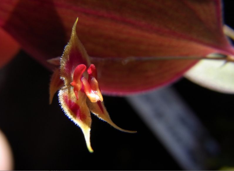 Found in Huanuco department of Peru in wet cloud forests on mossy branches at elevations around 2350 meters as a miniature to just small sized, cold growing epiphyte with erect, slender ramicauls enveloped by 4 to 6 glabrous, loose, infundibuliform sheaths carrying a single, apical, narrowly lanceolate, acuminate leaf taht blooms in the spring on several, , shortly pedunculate, filiform, arising on the back of the leaf, shorter than the leaf, to 1.6" [4 cm] long, successively single, sevedral flowered inflorescence with infundibuliform, obtuse, much shorter than the pedicel and carrying resupinate flowers with the hyaline dorsal sepal tinted pale green, and the midvein purple, the lateral sepals with pale green in the intervenal areas, the outer half of the petals crimson the rest bright yellow, the lip lateral lobes golden yellow with the margins light red, and the central lobe rose-pink.