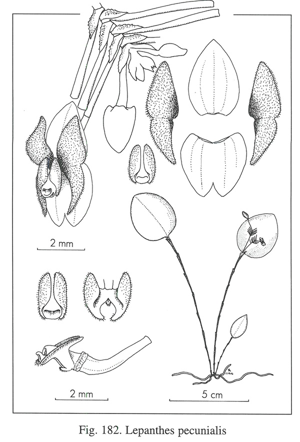 "Similar to L rotundifolia but L pecunialis is distinguished by the larger habit, and thicker, larger, copper colored leaves more ovate and obtuse than nearly perfectly round. The small but colorful flower are borne in congested, successively flowered racemes held behind the leaf." Luer 1996