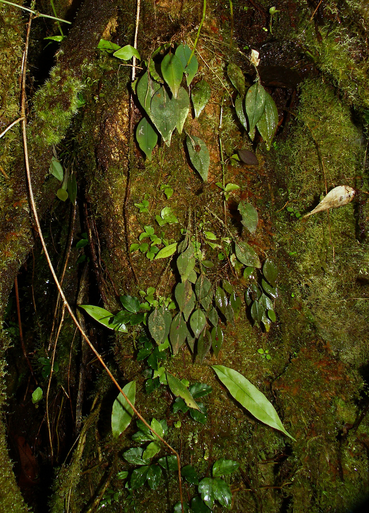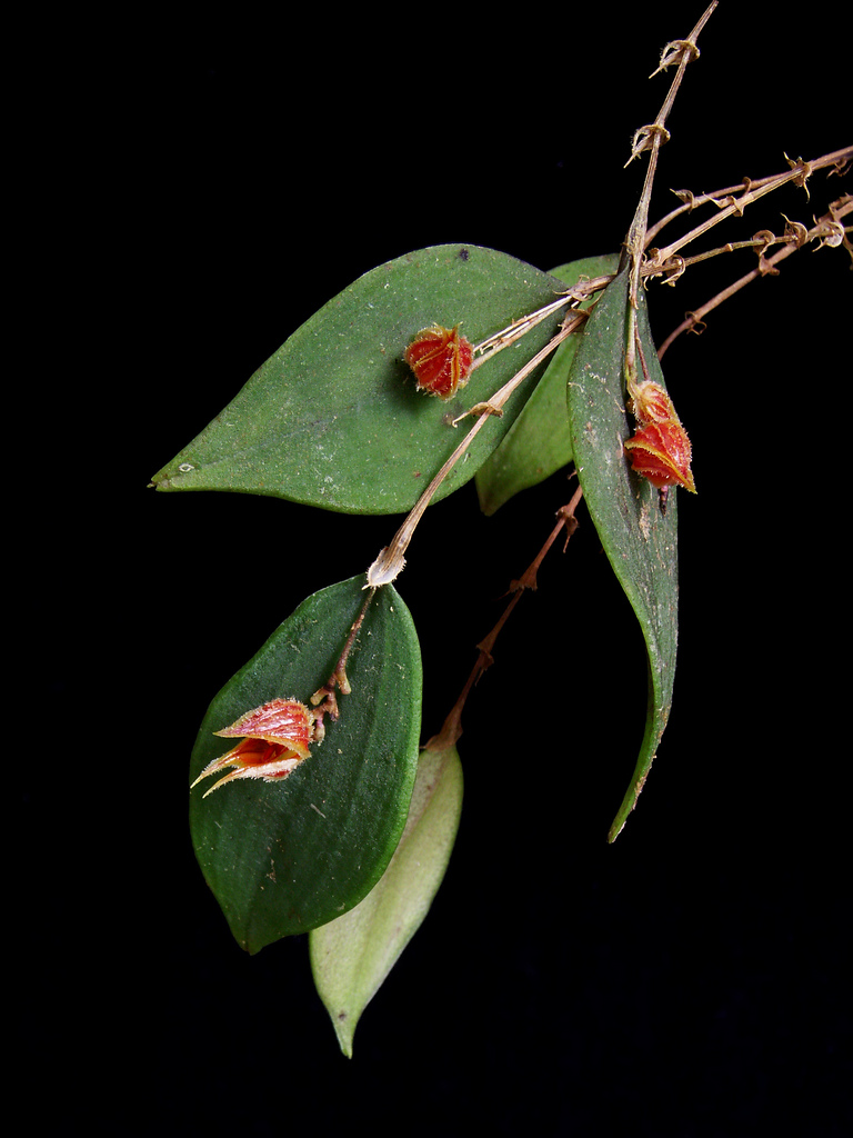 Found in Costa Rica in montane rain forests at elevations around 2100 meters as a mini-miniature sized, cold growing epiphyte with patent to arching, becoming pendant with age, slender ramicauls enveloped by 4 to 9, tight fitting, leapnthiform sheaths with dilate, ovate-acuminate ostia and carrying a single, apical, subcoriaceous, elliptic to elliptic-lanceolate, acute to shortly acuminate, minutely bilobed, abaxially mucronate, gradually rounded and contracted below into the inconspicuous, petiolate base leaf that blooms in the fall on a congested, distichous, filiform, to .6" [1.5 cm] long, racemose, successively few flowered inflorescence holding the flower on top of the leaf and has triangular, ovate, acute, amplectant floral bracts.