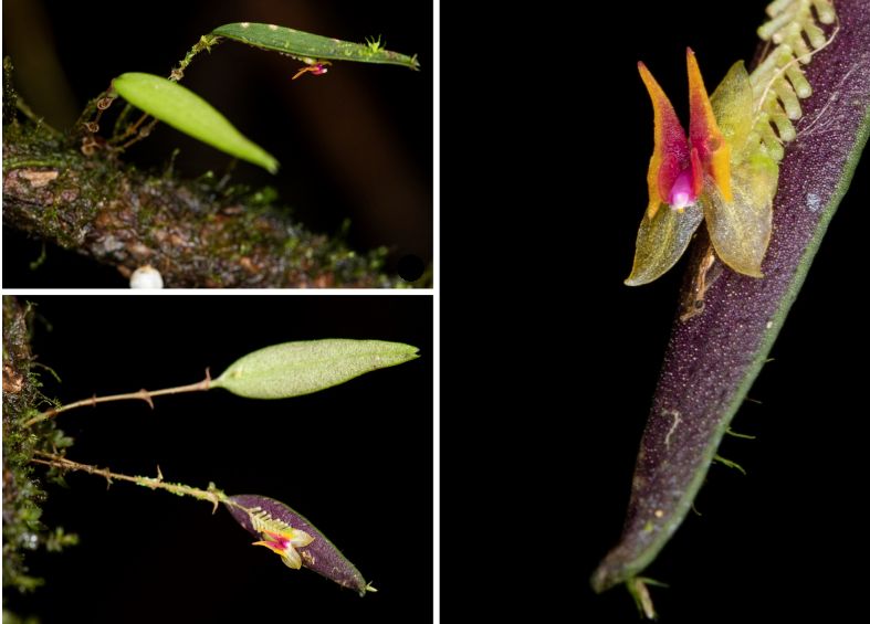 Found in Antioquia department of Colombia in primary forests on thin, moss covered branches over creeks at elevations around 2100 meters as a mini-miniature sized, cold growing, caespitose epiphyte with erect, slender ramicauls enveloped by 6 to 7, brownish, ribbed, thightly adpressed lepanthiform sheaths and carrying a single, apical, abaxially purple, thickly coriaceous, narrowly ovate, one main central vein, acute, incised and tri-apiculate apically, obtuse below into the petioalte base leaf that blooms in the later summer on a filiform .16" [4 mm] long, peduncle, arising and adpressed to the abaxial side of the leaf, rachis .28" [7 mm] long, congested, distichous, successively single, many flowered inflorescence with ovate, acute, covered with filiform papillae, shorter than the pedicel floral bracts.