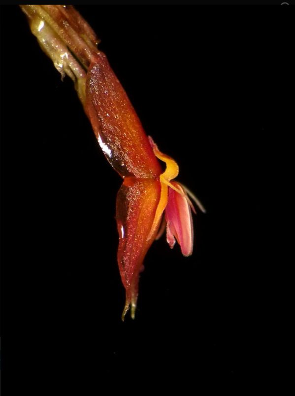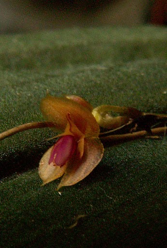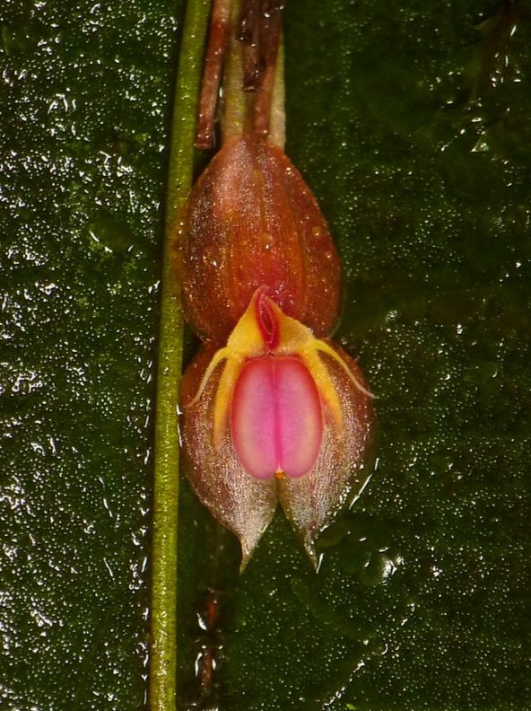 Found in Ecuador in cloud forests at elevations of 2000 to 2300 meters as a miniature to small sized epiphyte with slender, erect to suberect ramicauls enveloped by 10 to 18 minutely scabrous lepanthiform sheaths and carrying a single, apical, erect, thinly coriaceous, purple beneath, ovate, long-acuminate apically, the rounded to obtuse base contracted below into a petiolate base leaf that blooms in the spring and summer on an extremely congested, secund, slender, 2.4" [6 cm] long, successively many flowered, racemose inflorescence arising on the back side of the leaf.