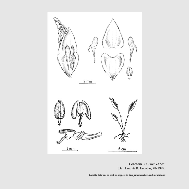 References W3 Tropicos, Kew Monocot list , IPNI ; *Orquideologia Vol 21 #2 pg 154 Luer & Escobar 1999 drawing fide; Icones Pleurothallidinarum Vol XXXII Luer 2012 drawing fide; Orchids, A Colombian Treasure Vol 3 Ortiz & Uribe 2019 drawing/photo fide;
