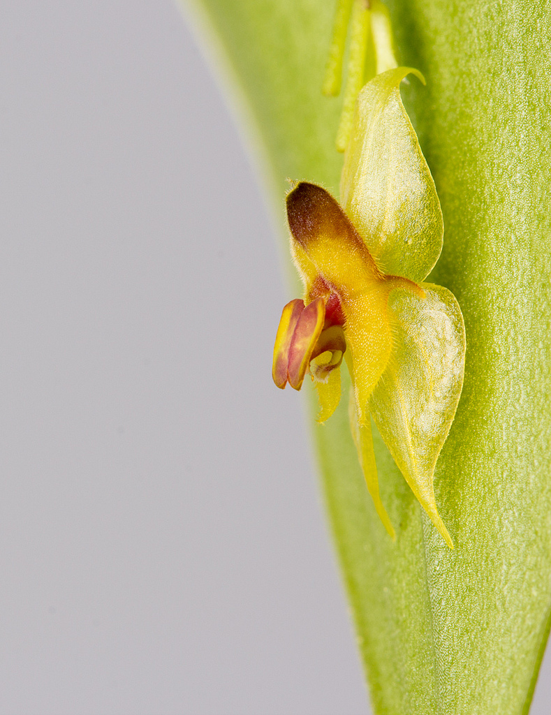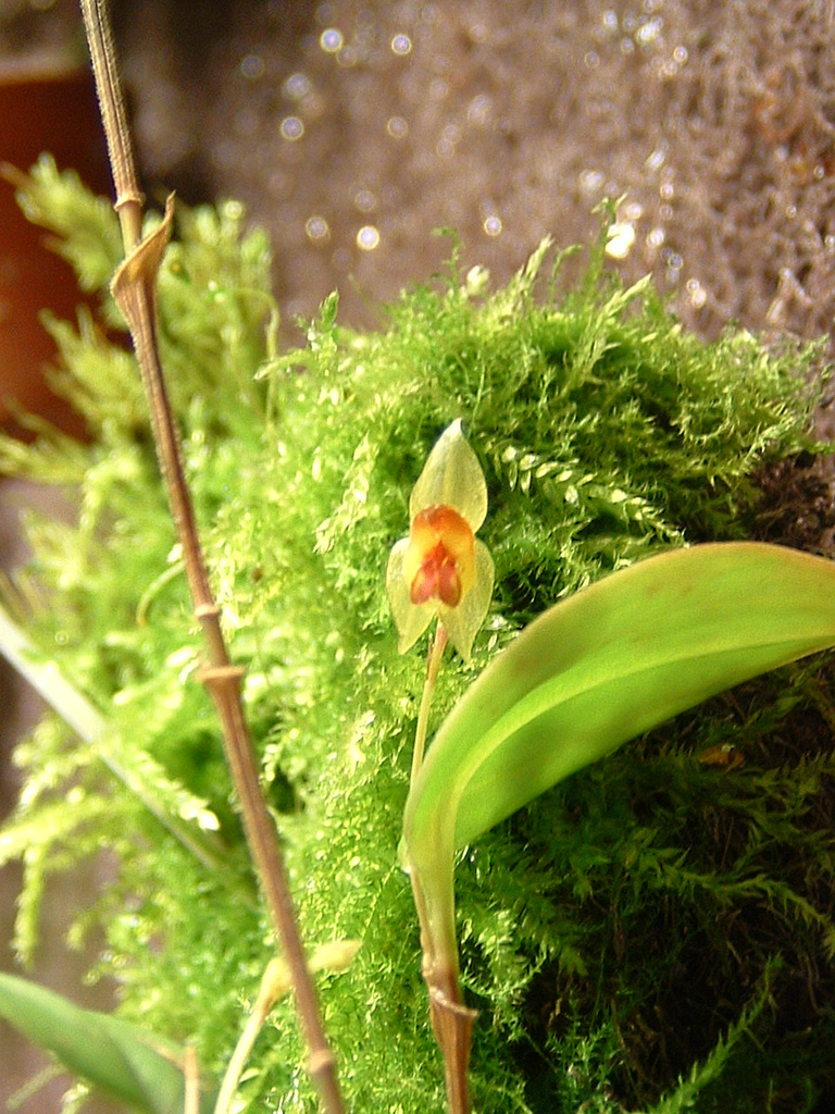 Found in Antioquia department of Colombia at elevations around 2700 meters as a miniature to small sized, cold growing epiphyte with slender erect ramicauls enveloped by 8 to 10, close, microscopically scabrous, lepanthiform sheaths and carrying a single, apical, erect, coriaceous, purple suffused beneath, ovate, acute, acuminate, minutely apicaulate, rounded below into the contracted petiolate base leaf that blooms in the winter on a filiform, very congested, 1.08 to 1.4" [2.7 to 3.5 cm] long including the .48 to .8" [1.2 to 2 cm] long peduncle, successively flowered inflorescence arising on the back of the leaf