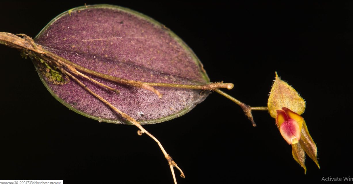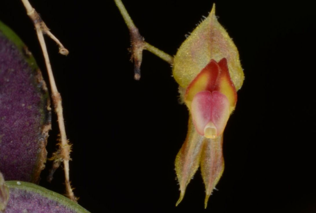 Found in Antioquia department of Colombia at elevations of 2680 meters as a mini-miniature sized, cold growing epiphyte with stout, erect, ramicauls enveloped by 6 to 7, minutely ciliate, lepanthiform sheaths with dilated, acuminate ostia and carrying a single, apical, erect, coricaceous, margined, purple suffused beneath, ovate, subacute, cuneate and contracted below into the petiolate base leaf that blooms in the later spring on a filiform, lax, .32 to .4" [8 to 10 mm] long including the .2 to .28" [5 to 7 mm] long peduncle, successively 2 to 3 flowered inflorescence arising on the back of the leaf.