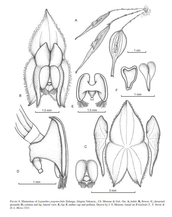"Lepanthes pogonochila shares many traits with L. impotens. Both species have caespitose and weak habit with the ramicauls slender to suberect; the leaves ovate, pendent, coriaceous with an apex long acuminate, like most of the species in the series Mucronatae proposed by Luer and Thoerle in 2011. The new species could be distinguished from the latter by its lip’s obovate blades covered by numerous dense, conspicuous bristles at the apex, a pubescent bisegmented appendix with the apical portion subquadrate and bilobed, and the basal portion concave (vs. the lip blades elliptical, with short trichomes, and an appendix reduced to a ciliate margin of the body of the lip) (Luer and Thoerle, 2012). Finally, the new species is also similar to L. oscillifera , but the apex of the blades are minutely ciliate (vs. covered by numerous dense and conspicuous bristles at the apex), the appendix broadly hinged from the center, flap-like, and the apical portion concave and ciliate with a minutely bilobed apex (vs. appendix with the apical portion subquadrate, bilobed, and the basal portion concave)." Gal.–Tar., Zuluaga, J.S. Moreno & Mora-Aguilar 2021