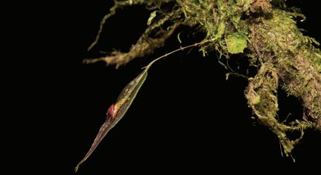 Found in Valle de Cauca department of Colombia in humid secondary forests at elevations around 1700 meters as a mini-miniature to miniature sized, cool growing, caespitose epiphyte with suberect, slender ramicauls enveloped by 7 to 10, furrowed lepanthiform sheaths, with a dilated, long-acuminate, ciliated ostia and carrying a single, apical, pendent, erect, thinly coriaceous, ovate, acute, long-acuminate,emarginate apically with an abaxial apiculum in the middle, rounded and contracted below into the cuneate, petiolate base leaf that blooms at least in the late summer and early fall on a filiform peduncle .176 to .28" [4.4 to 7 mm] long, arising on top of the leaf, rachis .48" to .52" [1.26 to 1.3 cm] long, congested, successively single, several flowered inflorescence with acuminate, shorter than the pedicel floral bract.