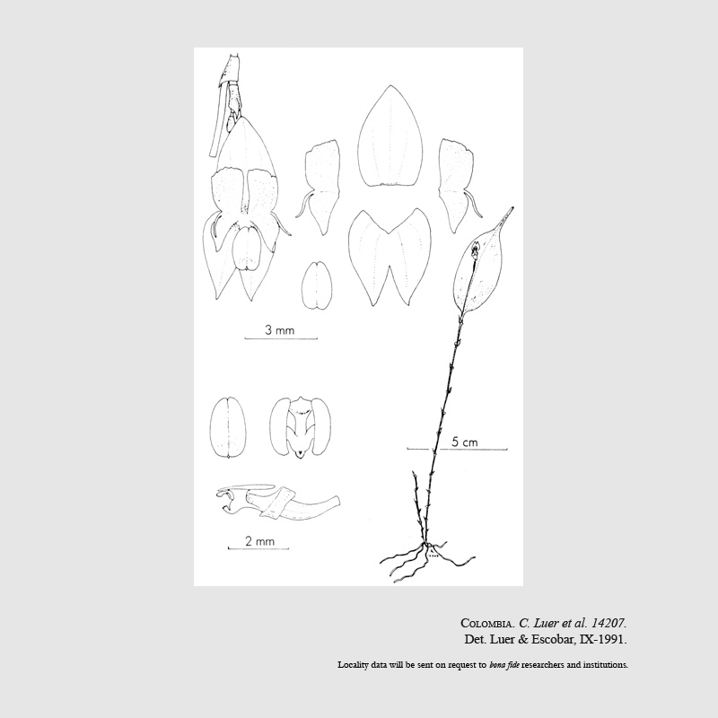 References W3 Tropicos, Kew Monocot list , IPNI ; *Orquideología 18(2): 143–145 Luer & Escobar 1991 Drawing fide, Icones Pleurothallidinarum Vol XXXII Luer 2012 drawing fide; Four new species of Lepanthes (Pleurothallidinae) from the southwestern Andes in Colombia photo fide; Orchids, A Colombian Treasure Vol 3 Ortiz & Uribe 2019 drawing/photo fide