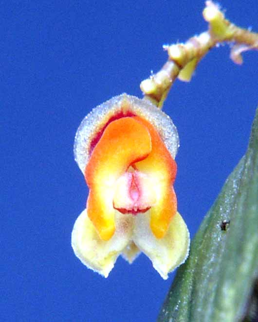 Found in Panama at elevations of 1000 to 1300 meters as a mini-miniature sized, warm to cool growing epiphyte with an erect ramicaul enveloped completly by 3 to 5 lepanthiform sheaths and carrying a single, apcial, erect, coriaceous, ovate, acute, minutely tridenticulate, gradually narrowing below into the petiolate base leaf that blooms in the winter on several, .8" [2 cm] long, successively single, several flowered inflorescence.